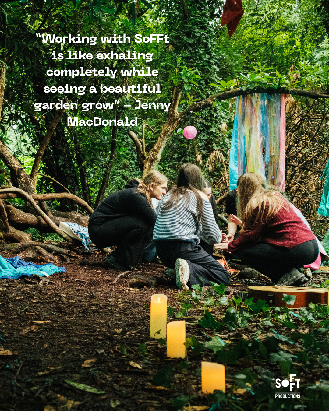 And then SoFFt said; Okay, we're going to build a sense of a festival. We're going to arrive with tents and marques, and they just transformed space. They gave us this base camp that we could then fly out of in terms of creating work throughout the park. And things that I really noticed was the incredible warmth, openness and engagement with all the artists, with all the young people, the really deep listening to what different people's ideas were and how they could land in with their technical expertise to those ideas, but also honour that impulse, especially in this case it was a youth- led project and SoFFt really listened to the young artists and worked with them and had this beautiful sense of equality. SoFFt are incredibly skilled at transforming space, at immersive work, at interactive work. So they brought all their skills to the game, but they never created a sense of hierarchy. So they were always working with the young artists as equal human beings, equal creatives, but people who are just at different stages of a journey.